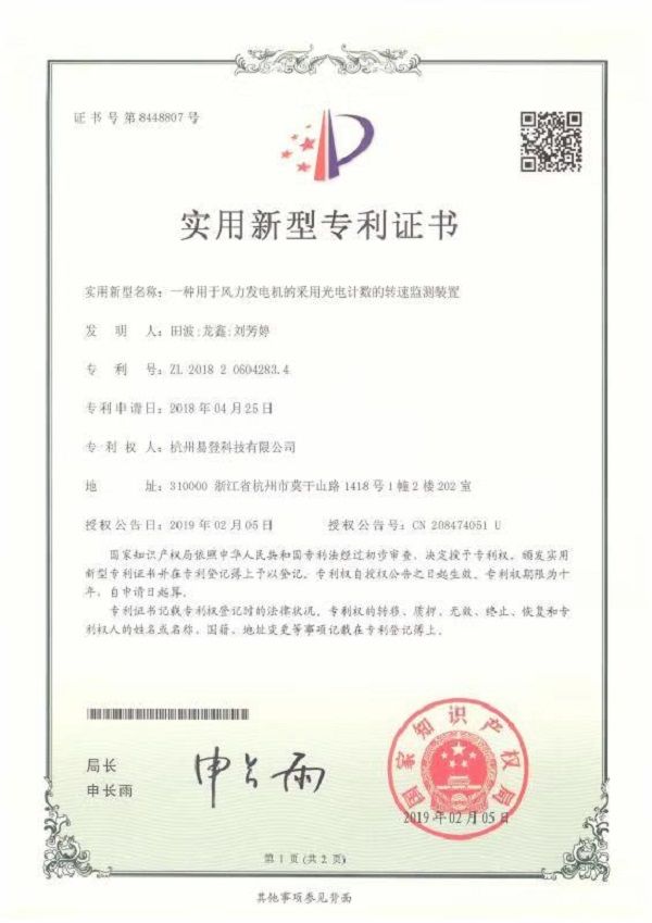 轉(zhuǎn)速監(jiān)測裝置專利證書